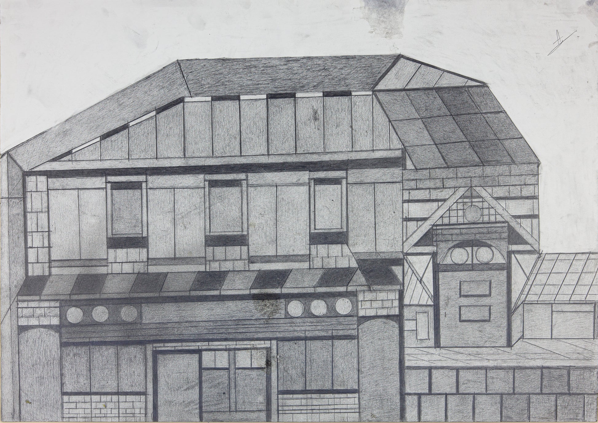 Albert’s large-scale pencil drawings depict visions of imaginary buildings, homes, fences and structures.