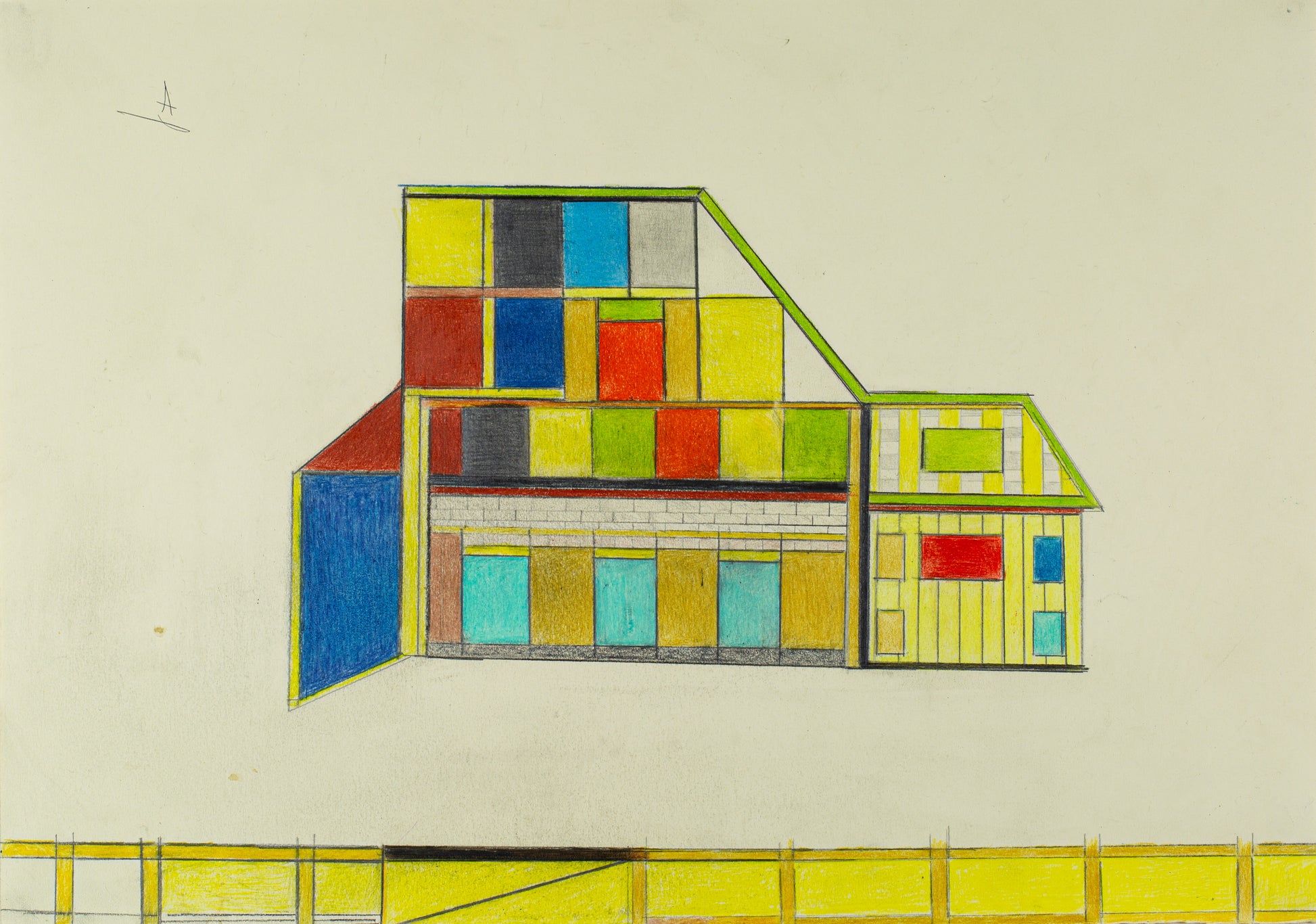 Albert’s large-scale pencil drawings depict visions of imaginary buildings, homes, fences and structures.
