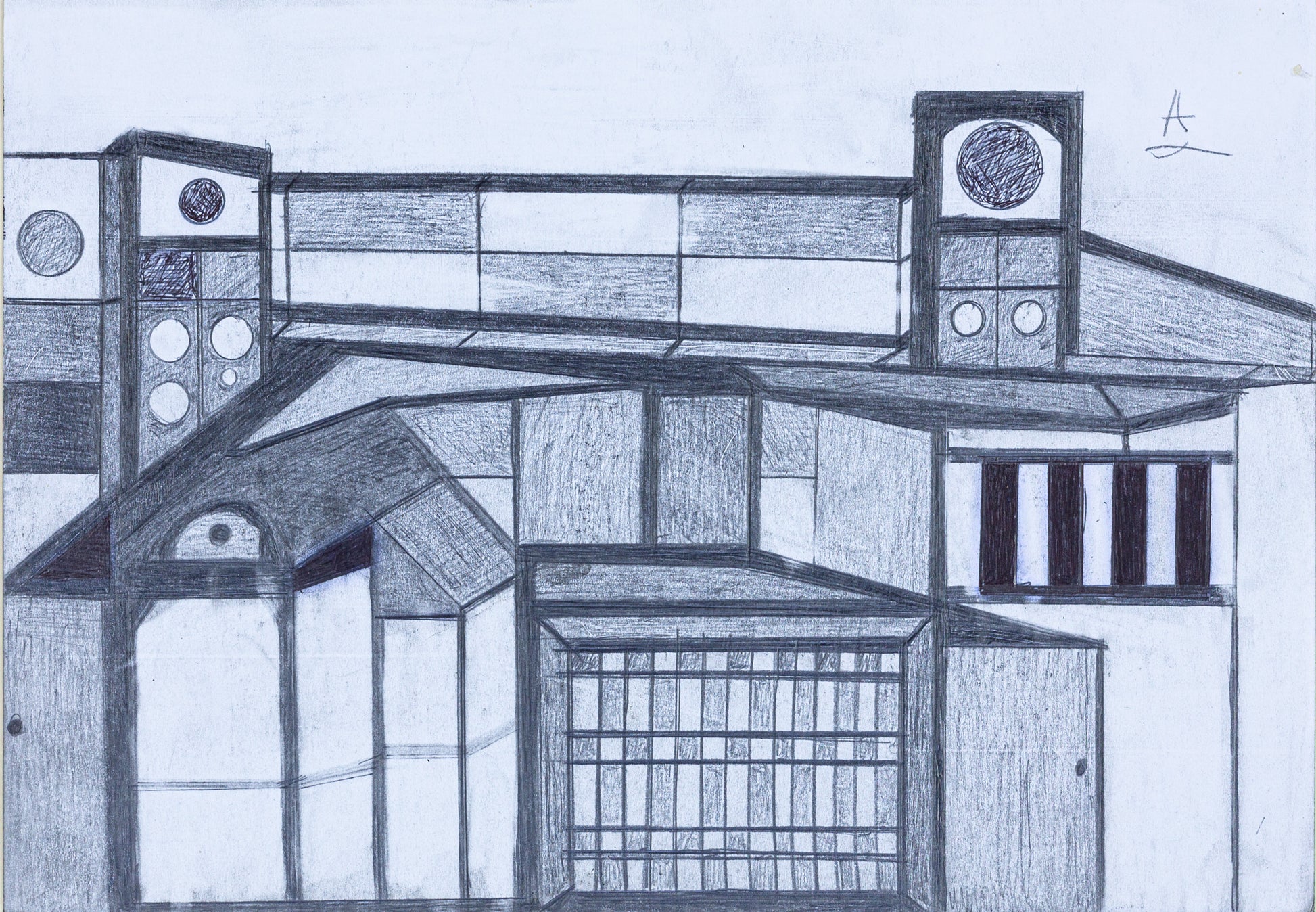 Albert’s large-scale pencil drawings depict visions of imaginary buildings, homes, fences and structures.